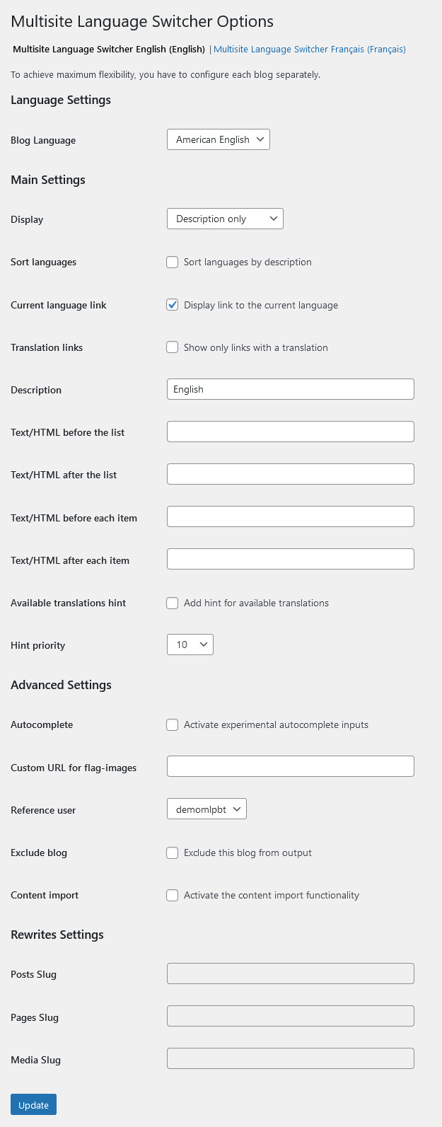 This is the English version on the subsite in English, connected to the subsite in French via the “Multisite Language Switcher”, a free plugin developed by Dennis Ploetner. It works on a multisite and everything is separated. You can then have different themes, plugins or content per language and link only what you want. It then doesn’t impact performance and makes it easy to have separate domains if needed. The only slight issue with that solution is when you have some paid plugins, as subsites will be considered as separate websites and you’ll often need more than 1 licence.